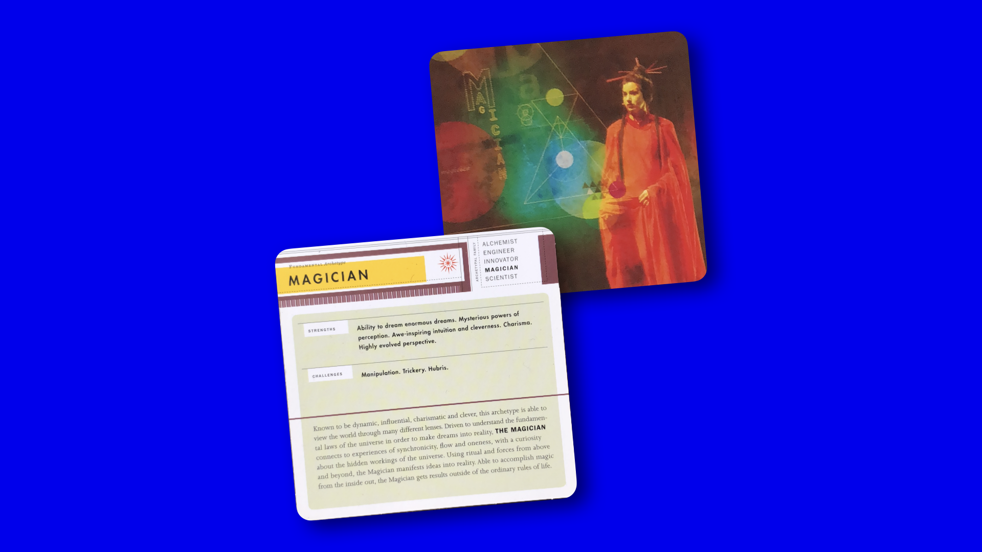 “Dreams enormous dreams; mysterious power of perception; awe-inspiring intuition and cleverness charisma; highly evolved perspective – Driven to understand the fundamental laws of the universe in order to make drams into reality, the Magician connects to experiences of synchronicity, “flow” and oneness”, with a curiosity about the idea workings of the universe. The Magician associates and aligns with truth to create mutually beneficial outcomes. Using ritual and forces from above and beyond, the Magician manifests ideas into reality, transforming the earthly plane for good. Able to accomplish magic from the inside out, the Magician gets results outside the ordinary rules of live.